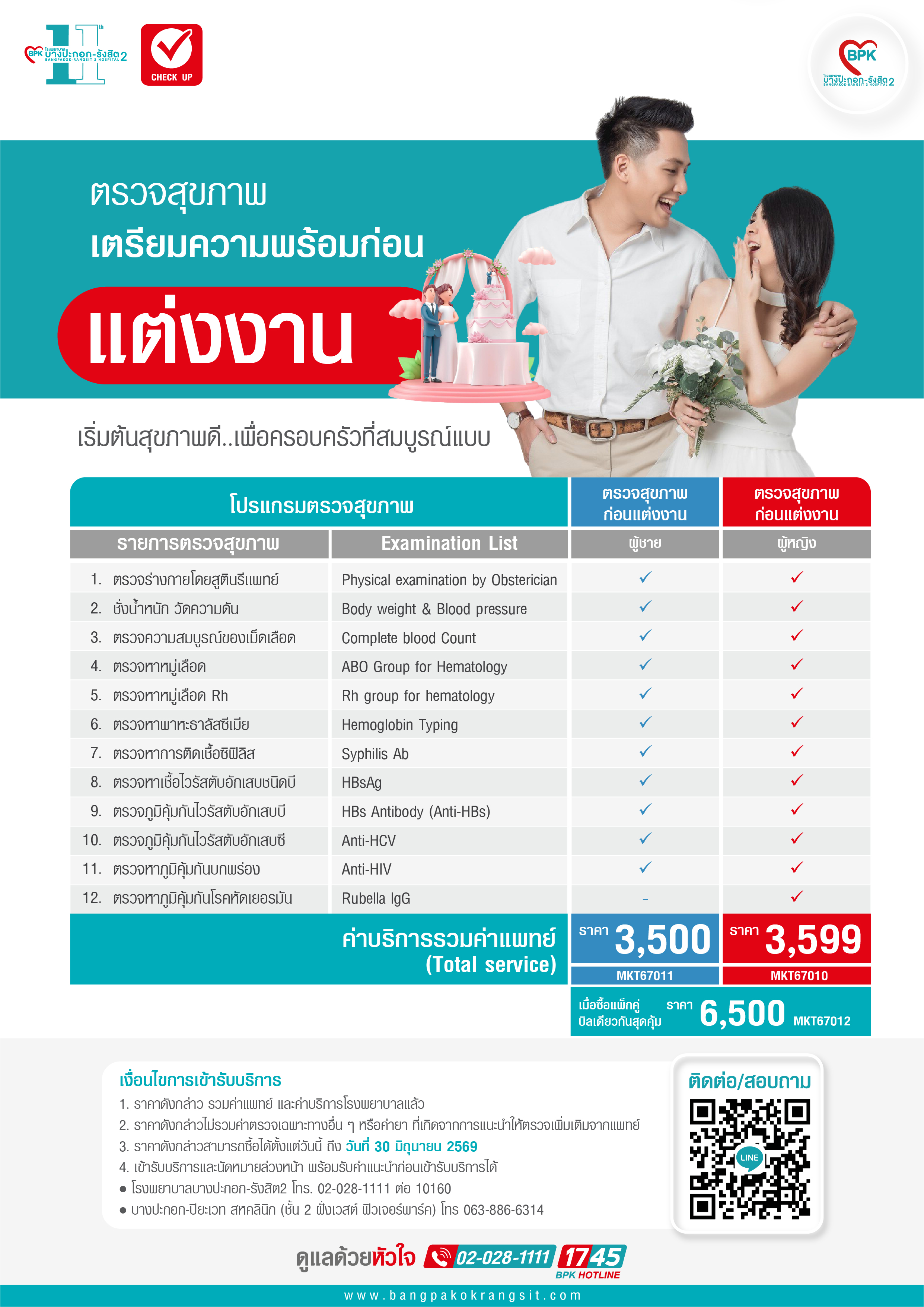 2026 โปรแกรมตรวจสุขภาพก่อนแต่งงาน (สำหรับผู้ชาย) ที่ โรงพยาบาลบางปะกอก-รังสิต2