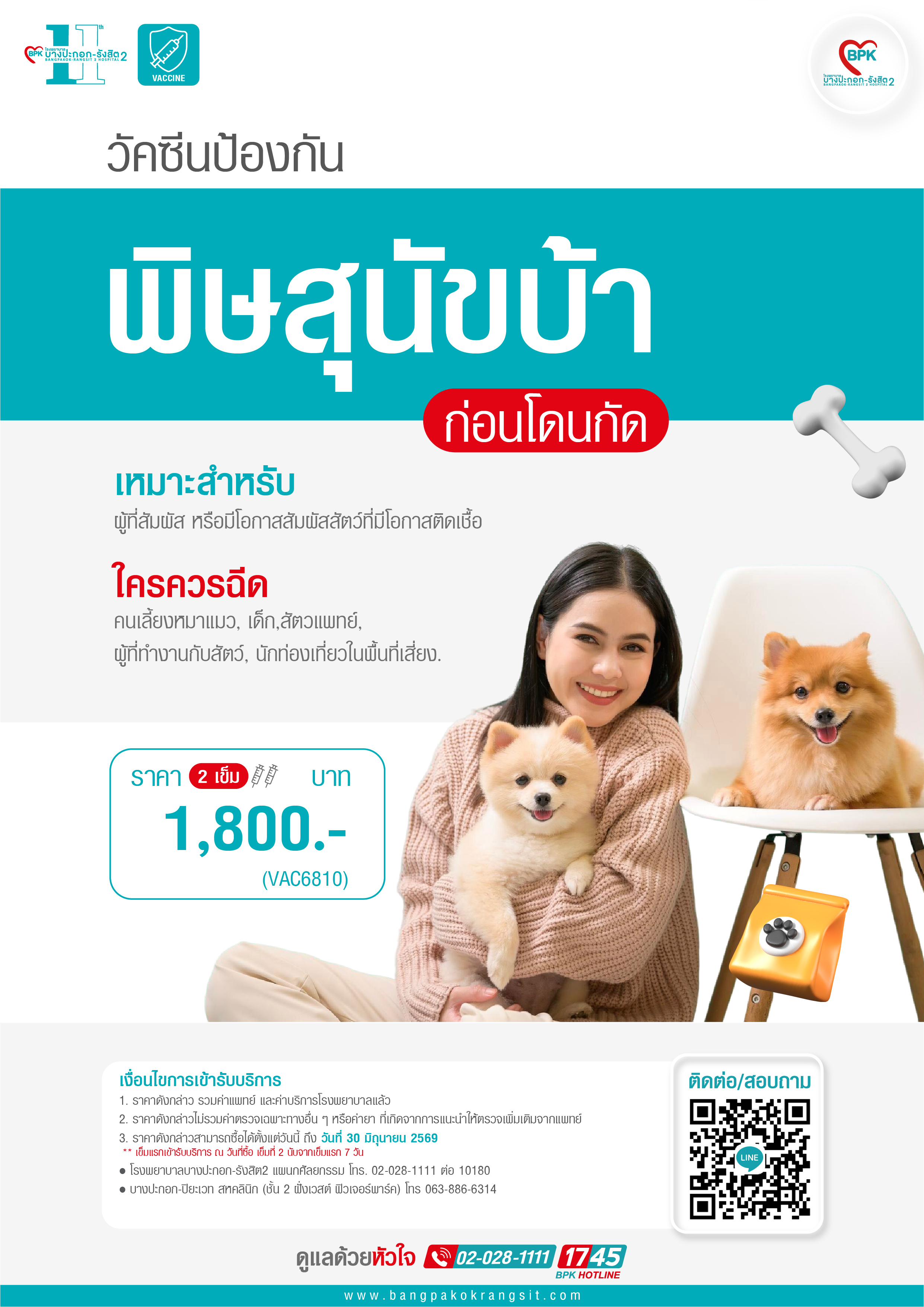2026 วัคซีนป้องกัน พิษสุนัขบ้า ก่อนโดนกัด (2เข็ม) ที่ โรงพยาบาลบางปะกอก รังสิต 2
