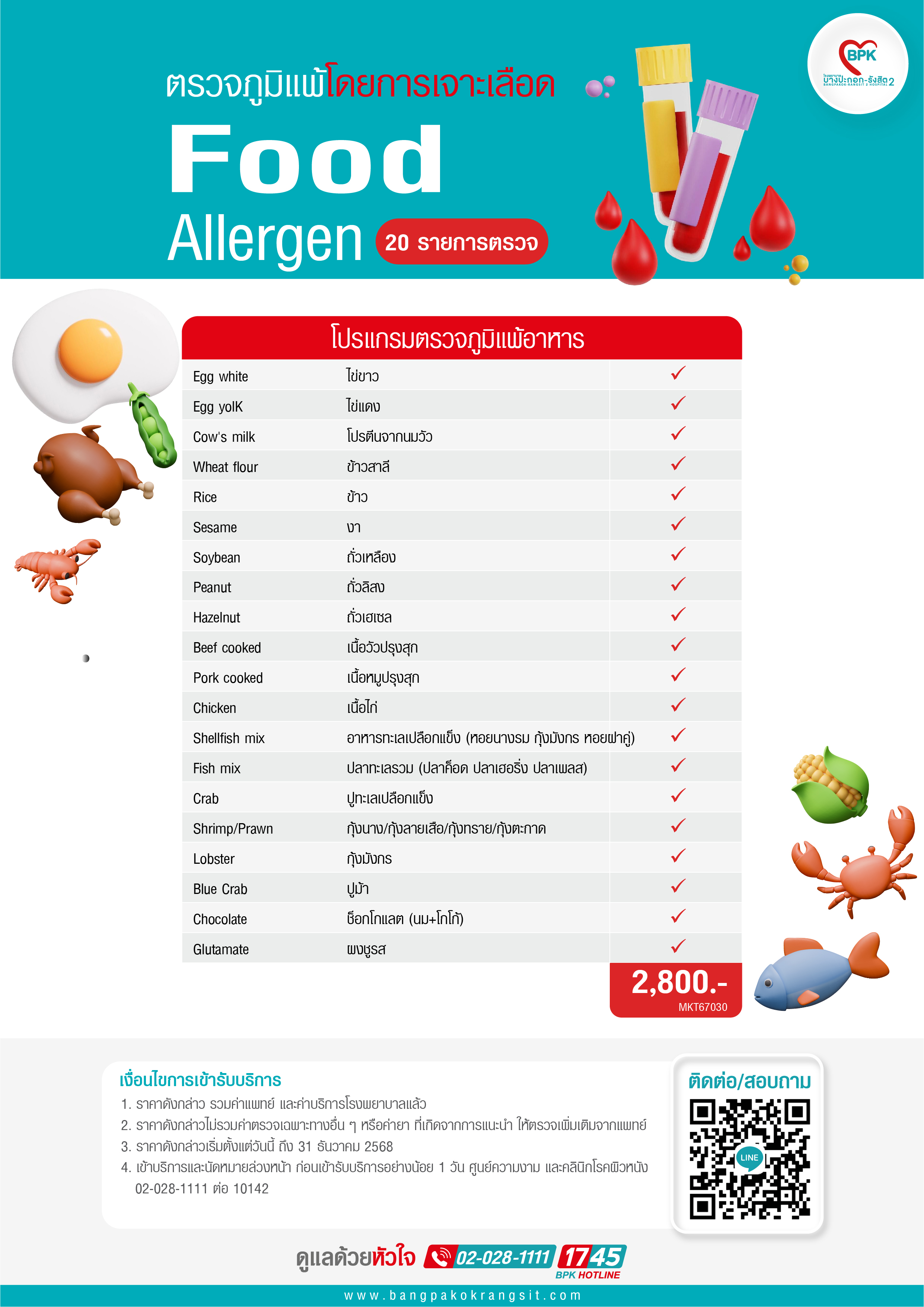 ตรวจภูมิแพ้ผิวหนังและแพ้อาหาร 20 รายการ ด้วยวิธีเจาะเลือด (Food Allergen) ที่ โรงพยาบาลบางปะกอก-รังสิต2