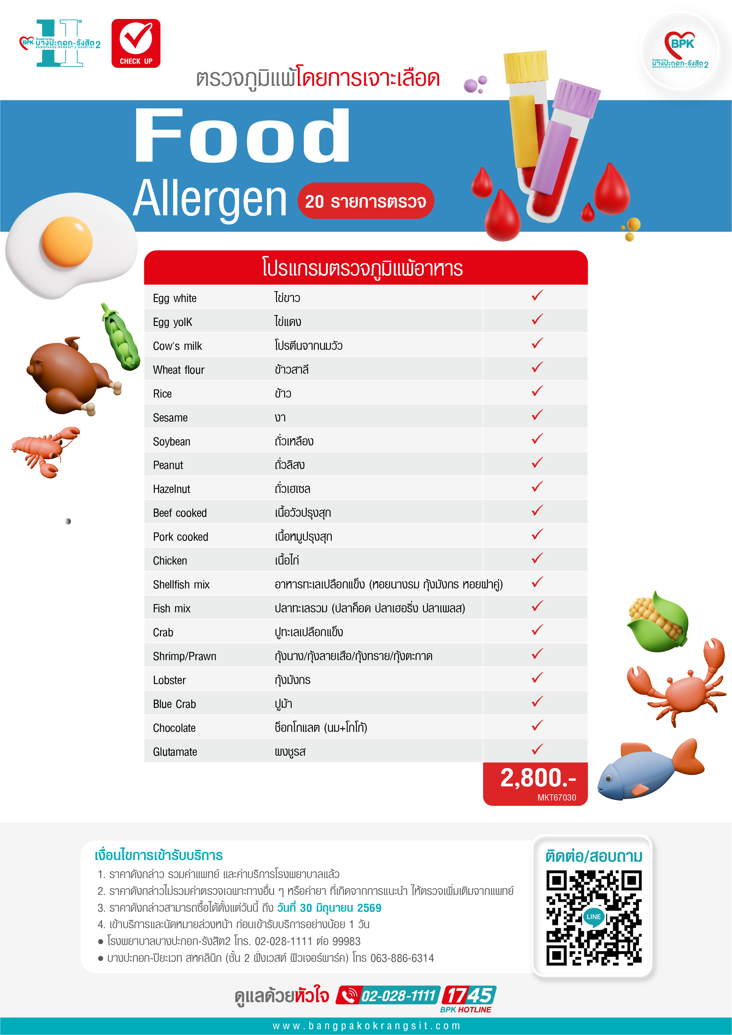 2026 ตรวจภูมิแพ้ผิวหนังและแพ้อาหาร 20 รายการ ด้วยวิธีเจาะเลือด (Food Allergen) ที่ โรงพยาบาลบางปะกอก-รังสิต2